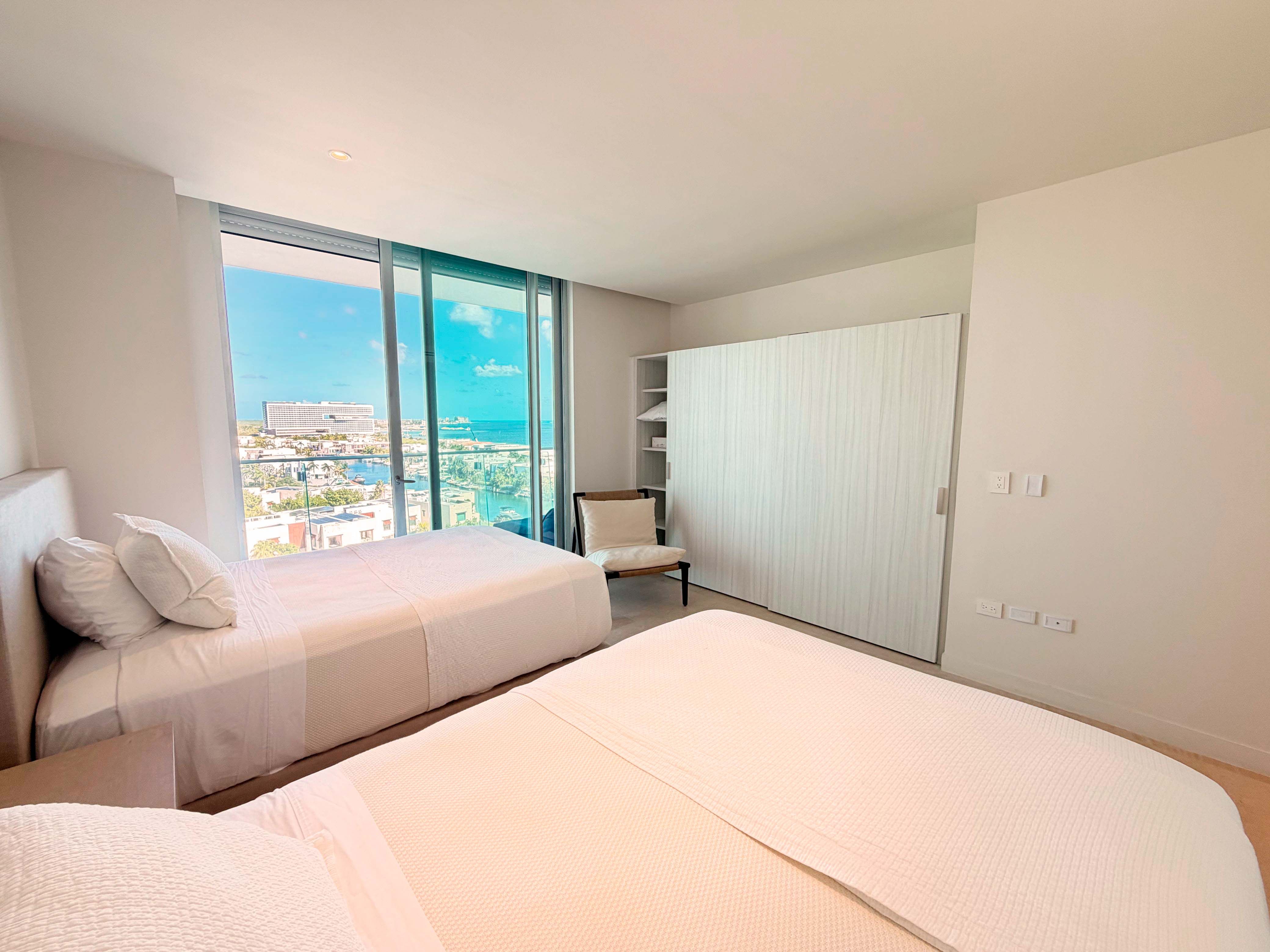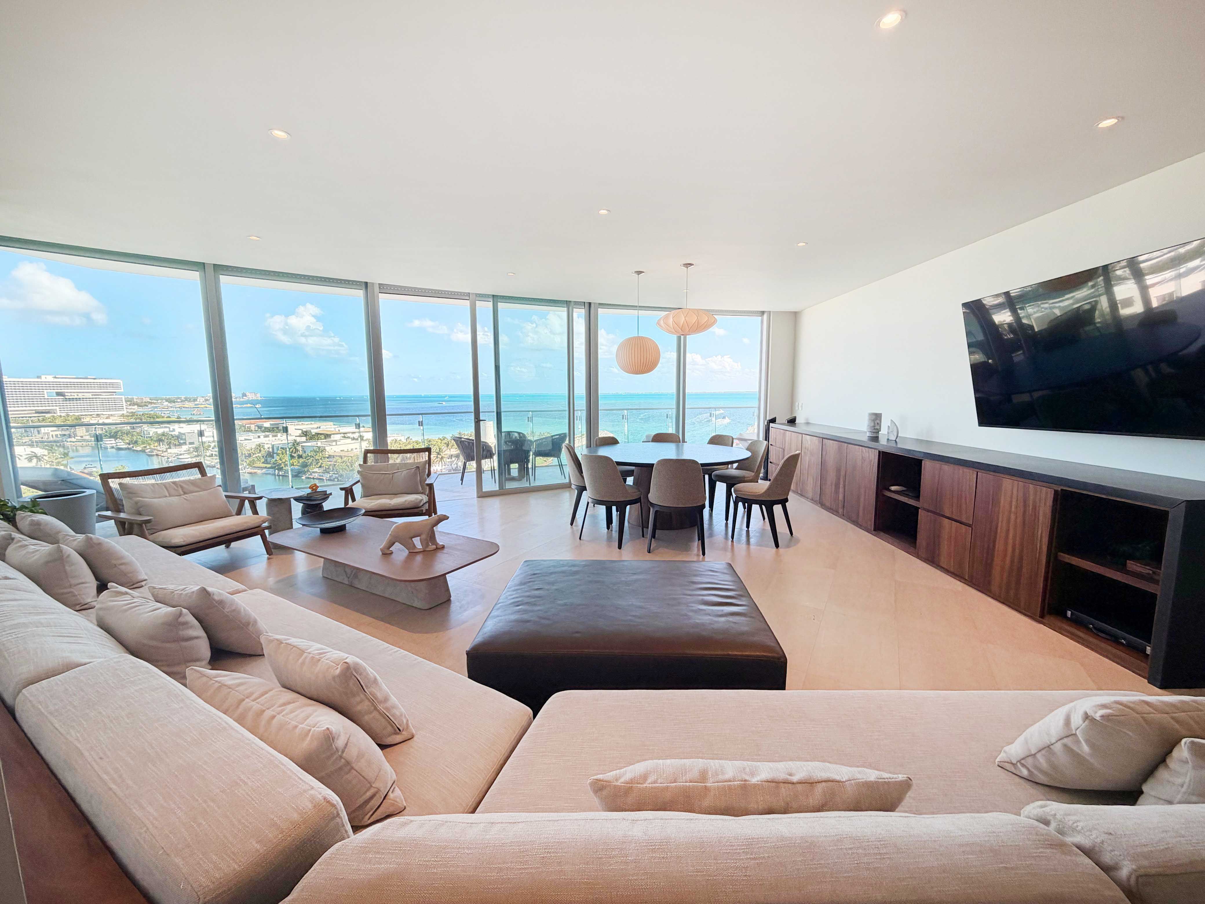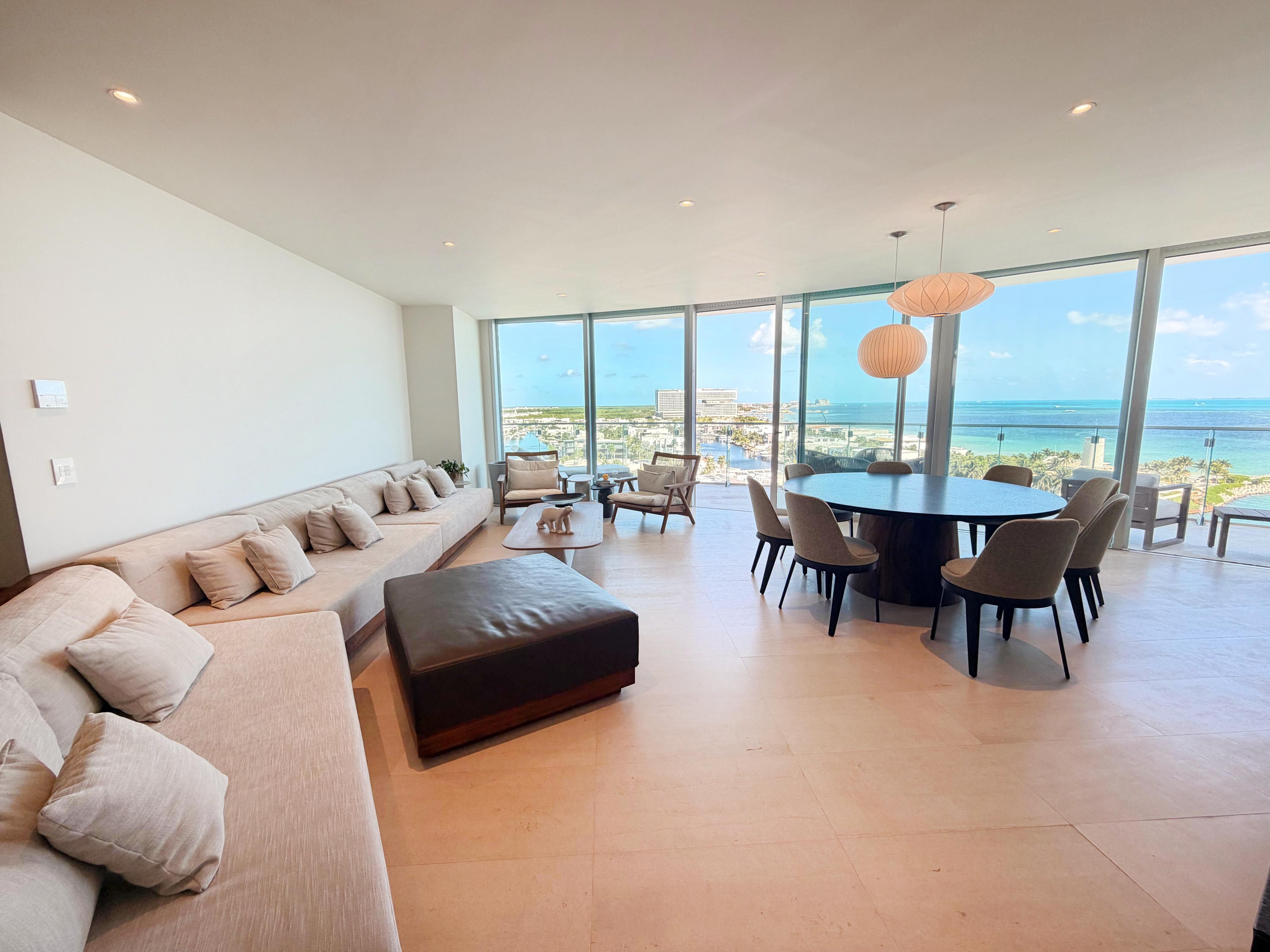 Ubicado en el piso 10 de la exclusiva torre SLS Harbour, dentro del prestigioso complejo Puerto Cancún, este espectacular departamento amueblado de 291 m² redefine el concepto de lujo frente al mar. Desde sus amplios ventanales y terrazas se aprecian vistas panorámicas incomparables al Mar Caribe, donde cada amanecer y atardecer se convierte en un espectáculo natural digno de admirar. Su diseño contemporáneo combina elegancia, confort y funcionalidad en cada detalle, con una decoración de autor, mobiliario de alta gama y una cocina completamente equipada. Cuenta con tres recámaras más un estudio o cuarto de TV que puede adaptarse como cuarta habitación, cuatro baños completos, cuarto de servicio y de lavado, además de dos espacios de estacionamiento techado. Cada rincón fue diseñado para ofrecer bienestar, privacidad y una conexión constante con el entorno marino. La torre SLS Harbour es sinónimo de sofisticación y servicio de clase mundial, ofreciendo amenidades de primer nivel como dos albercas, spa, gimnasio, cine, ludoteca, coworking, valet parking y acceso directo a la playa. Además, sus residentes disfrutan de los privilegios del exclusivo club de NovoCancún, con cinco albercas adicionales, gimnasio y restaurante frente al mar.