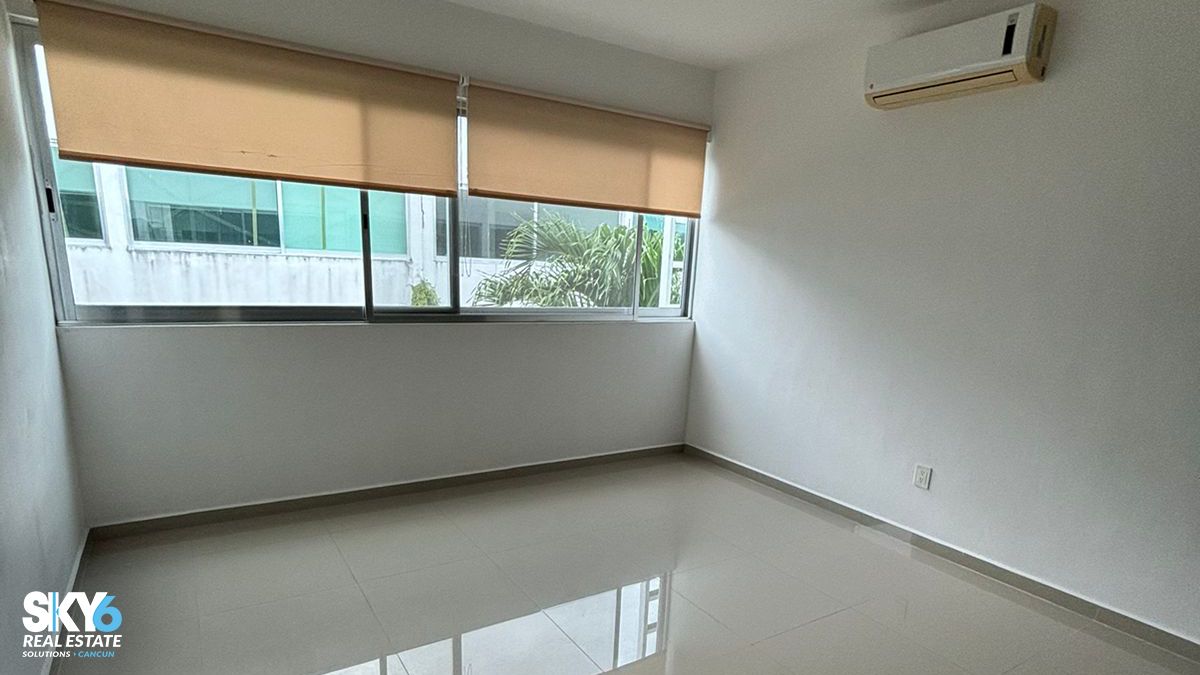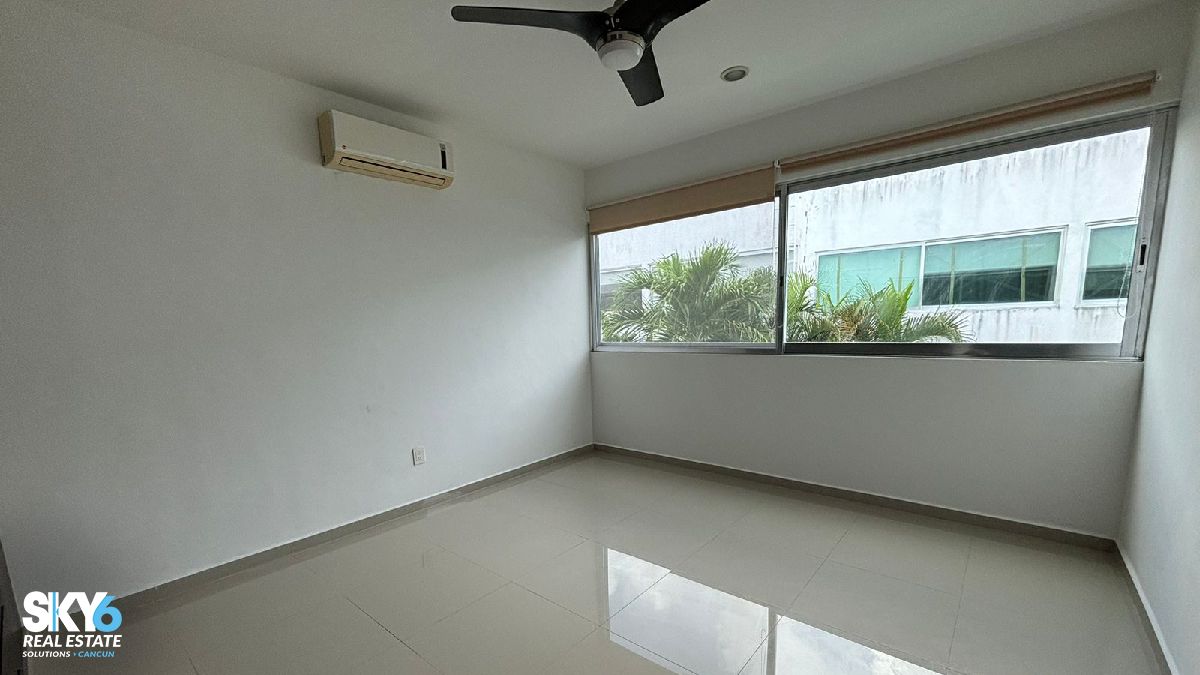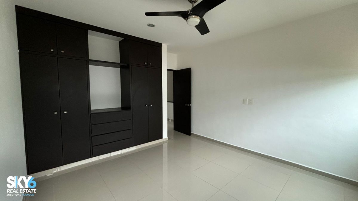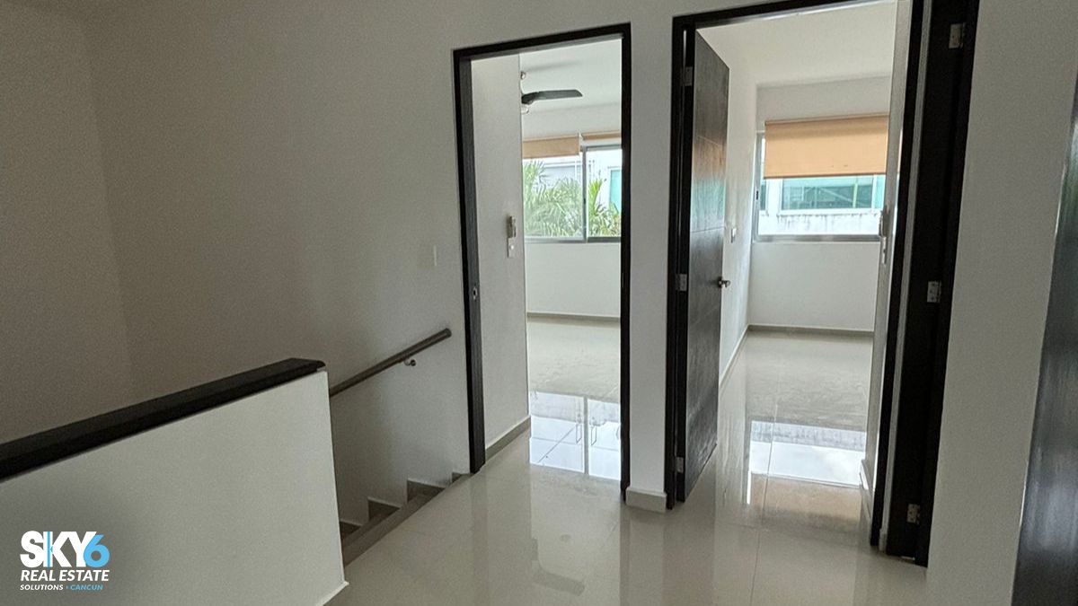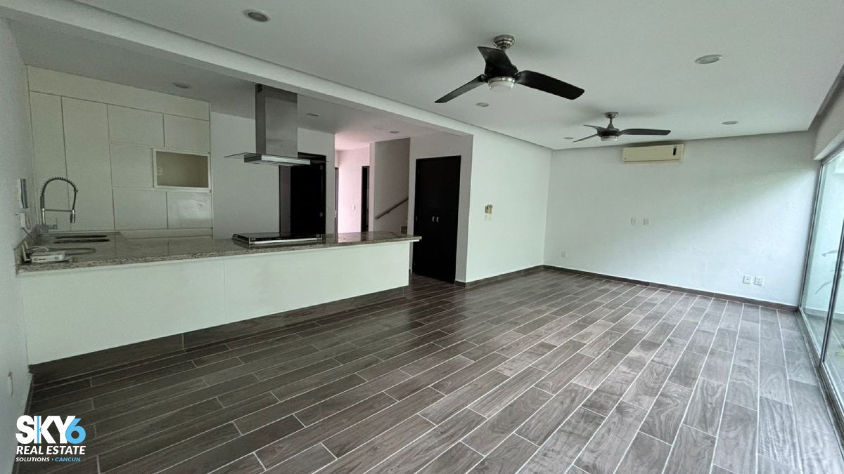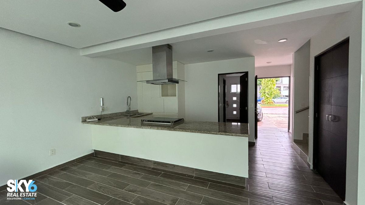 La casa en Residencial Palmaris se distingue por su diseño funcional y elegante, ofreciendo una cocina integral equipada que facilita la preparación de tus comidas diarias con comodidad. Además, incluye un cuarto de servicio, lo que añade un toque de conveniencia para el día a día. La propiedad también cuenta con aires acondicionados y ventiladores, asegurando un ambiente fresco y agradable en todo momento, perfecto para el clima de Cancún.