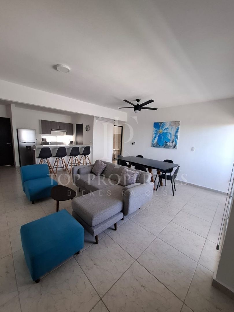 Áreas Sociales: Espacio abierto para sala y comedor que conecta con una cocina funcional.
